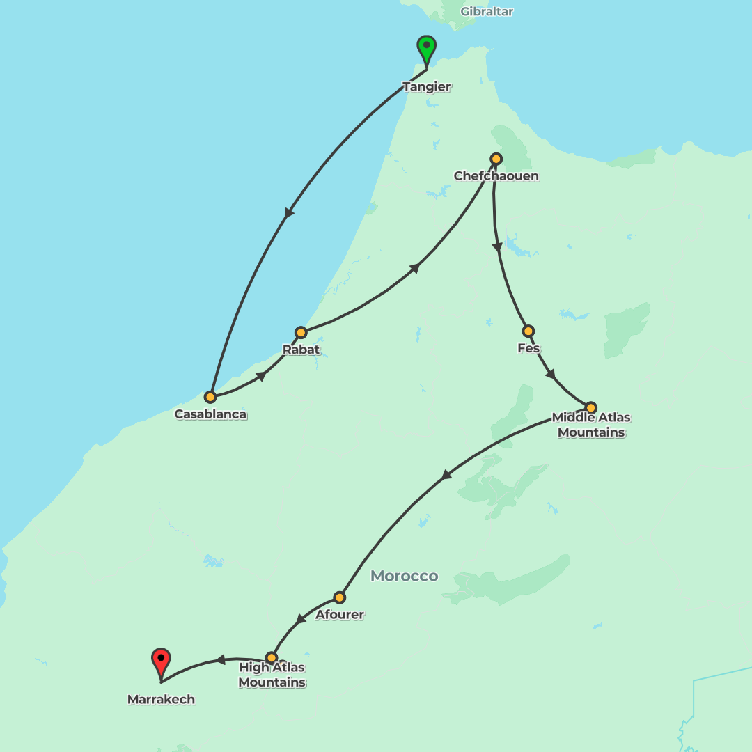 Explore Morocco’s imperial cities, mountain passes, Sahara camps and Atlantic towns on a three‑week journey roundtrip from Marrakech, blending guided walks with time to relax in Essaouira and Mirleft.