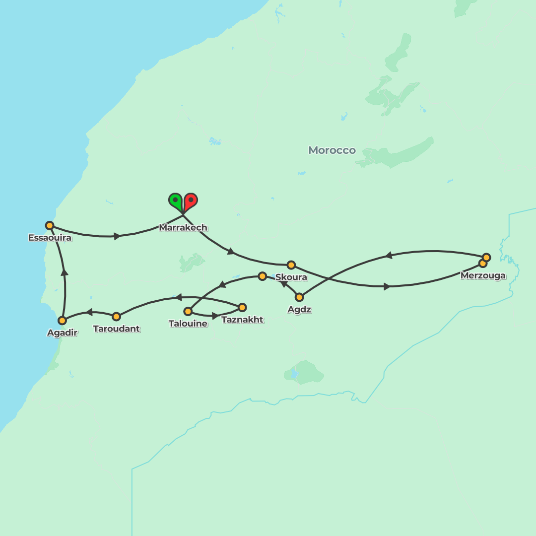 Discover Morocco’s souks and sand dunes on a 9-day Marrakech round-trip featuring Ait Benhaddou, the Draa Valley, Todra Gorge and a night in a Berber desert camp.