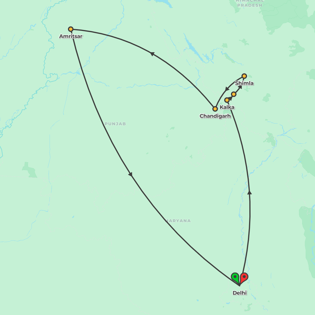 Explore Shimla, Chandigarh and Amritsar on a 7-day small group tour featuring the Himalayan Queen Toy Train, guided city highlights, and the Wagah border ceremony.