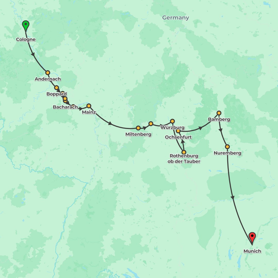 Enjoy a tour of Mainz with its beautiful stained glass windows in Saint Stephen’s Church, and the Baroque jewel Wurzburg with its famous Residenz palace and overlooked by the impressive Marienberg Fortress.