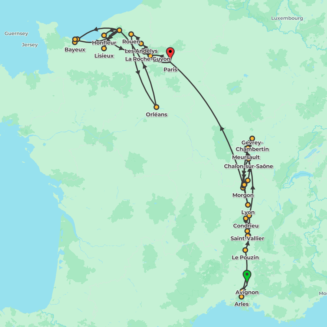 A 14‑night French river journey combining the Seine, Saône and Rhône, with guided tours of historic cities, Normandy highlights and tranquil countryside vistas.