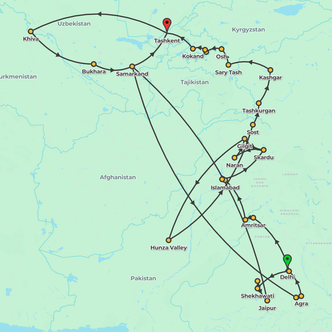 Trace the Silk Road from Delhi to Tashkent on a 35-day journey through India, Pakistan, China, Kyrgyzstan and Uzbekistan.