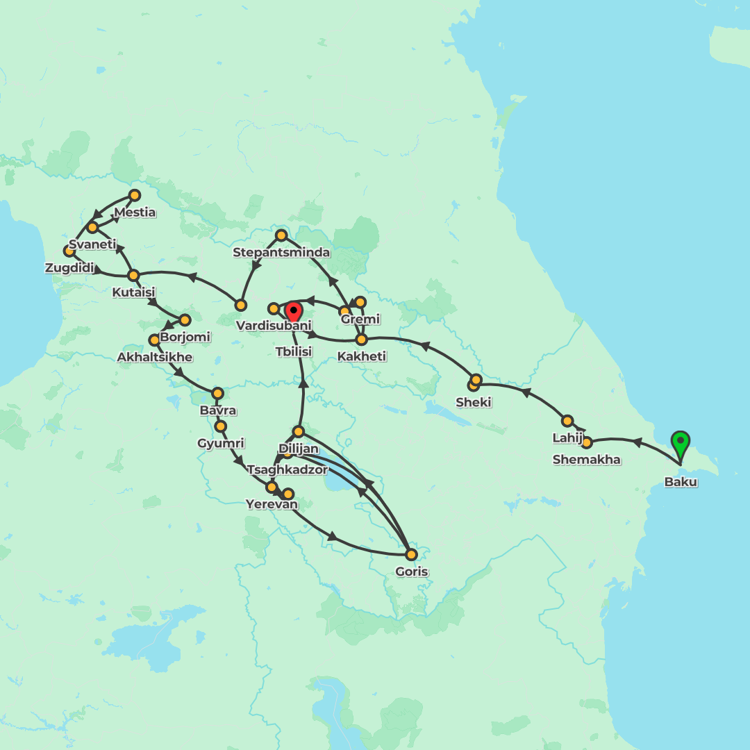 Explore the Caucasus on a 19-day journey from Baku to Yerevan, uncovering historic cities, mountain landscapes, and UNESCO-listed monasteries across Azerbaijan, Georgia, and Armenia.