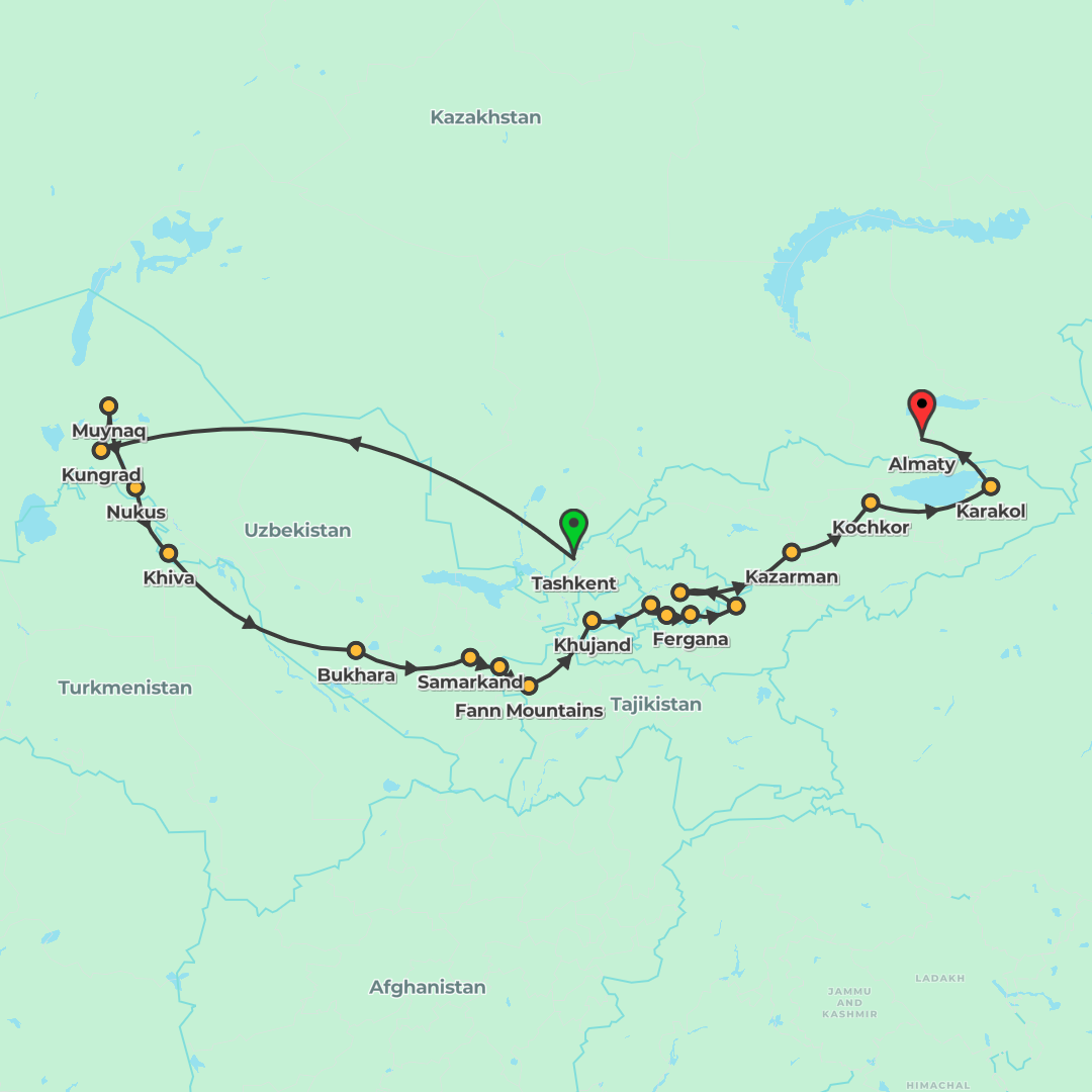 A 30-day Silk Road odyssey from Almaty to Tashkent across Kazakhstan, Kyrgyzstan, Tajikistan, Uzbekistan and Turkmenistan, featuring mountain valleys, ancient cities, the Darvaza Crater and an overnig