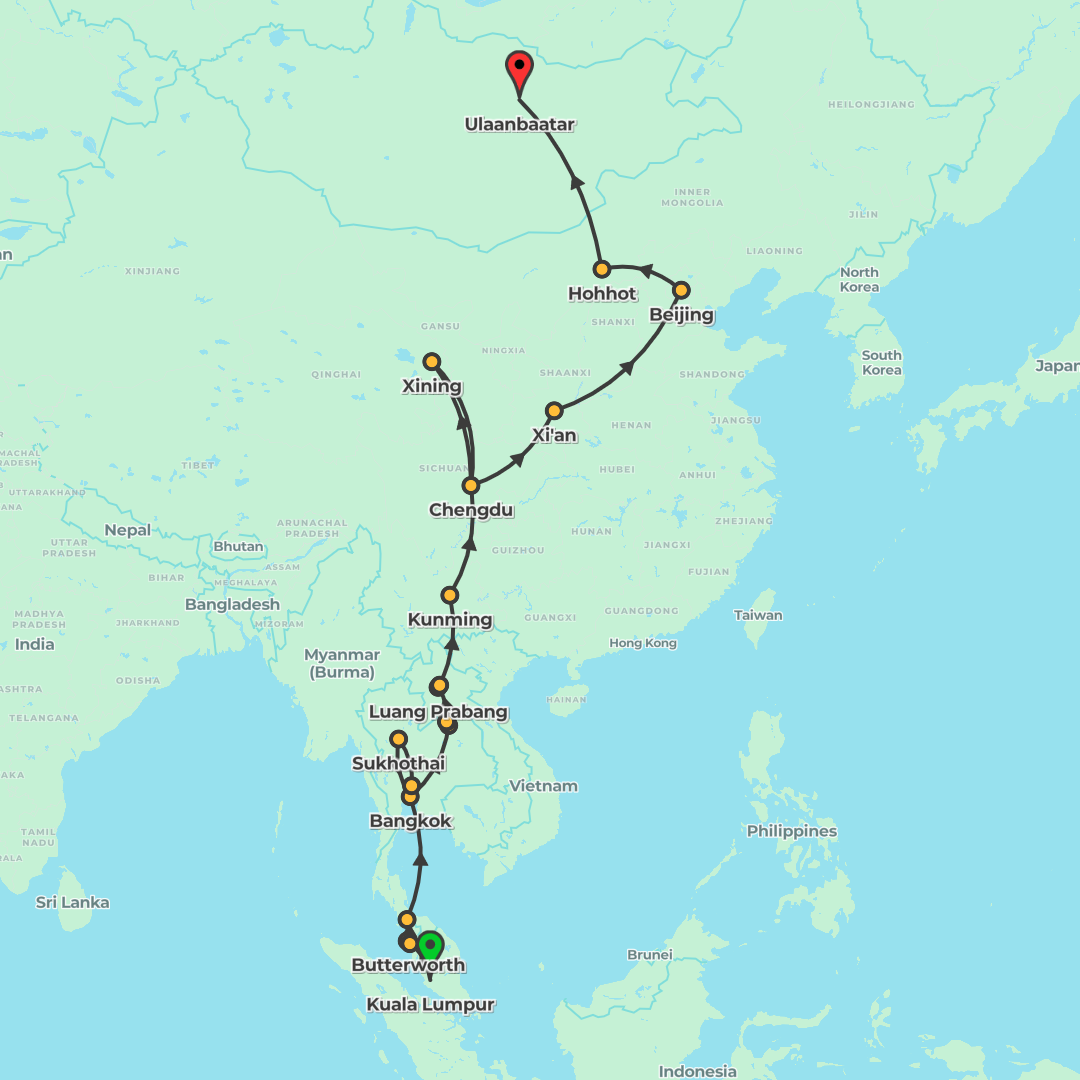 Journey by train from Kuala Lumpur to Ulaanbaatar via Thailand, Laos and China, culminating on the Trans Mongolian Railway with a memorable night in a Mongolian ger.