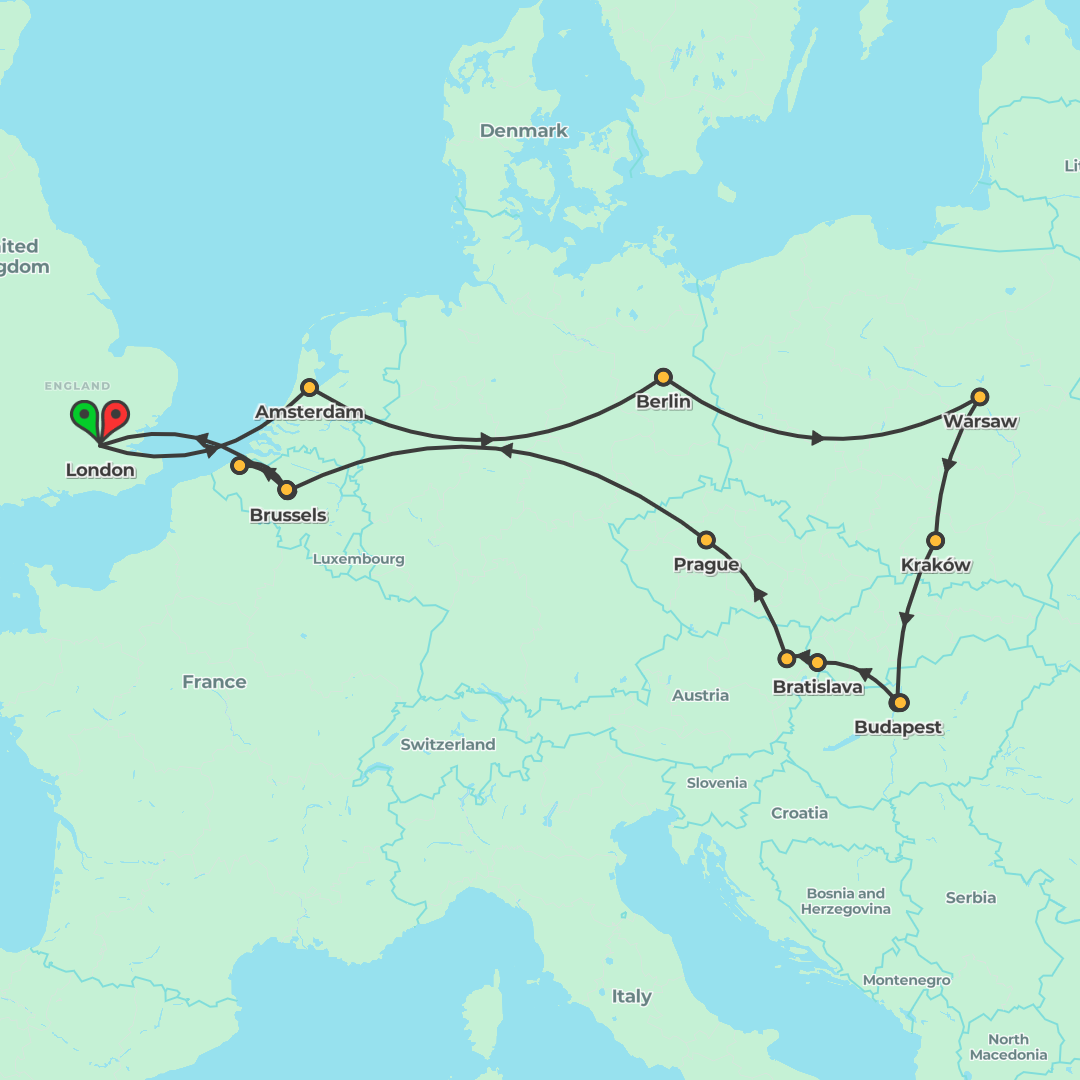 Embark on a youth-focused European epic from London through 14 countries and back, led by a Trip Leader with trains, coaches and ferries linking iconic cities and coastlines, packed with walking tours