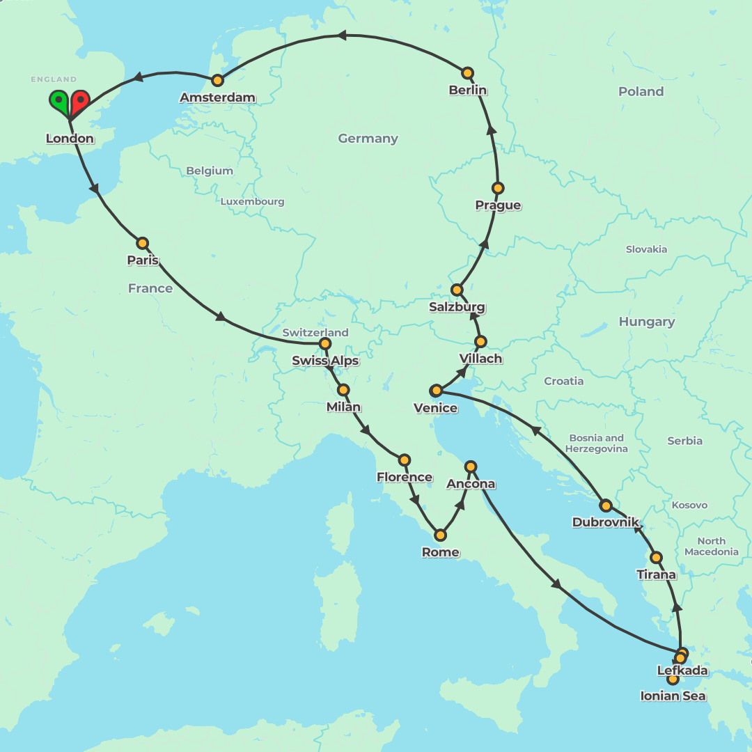 A 45-day adventure from London exploring iconic cities and landscapes across Europe and Türkiye, with flights to Egypt for Cairo, Aswan, Luxor and the Red Sea, plus ferries, an overnight train and spe