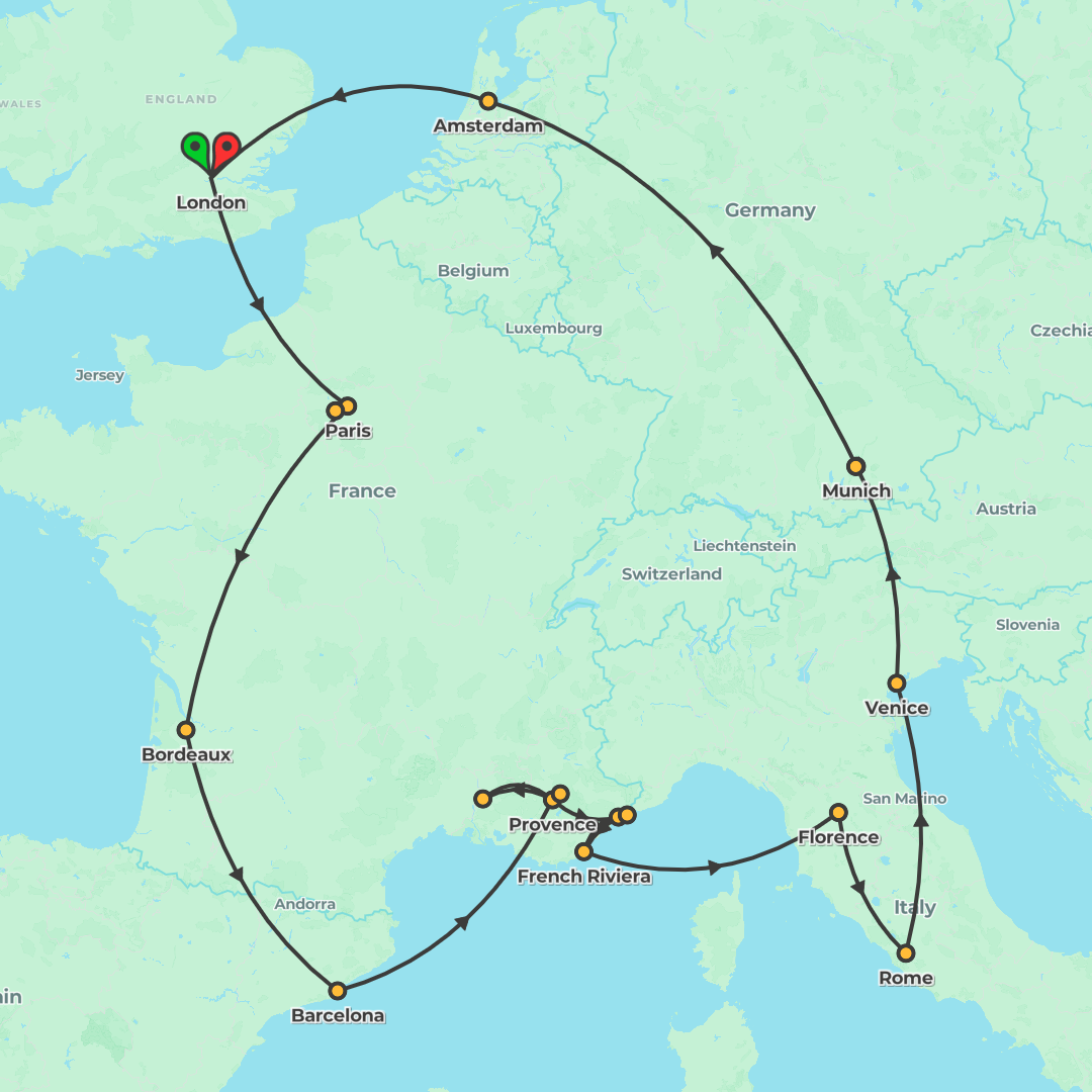 Embark on a 25-day European adventure from Paris to London, exploring iconic cities, stunning coastlines, and cultural landmarks across nine countries.