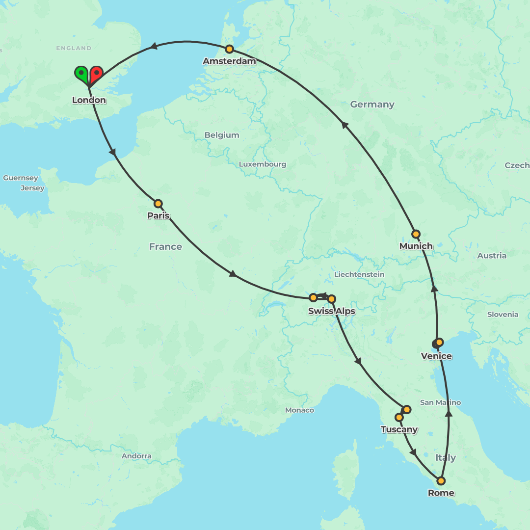 Embark on a whirlwind European adventure from Amsterdam to London, exploring iconic cities, stunning landscapes, and rich cultures across multiple countries.