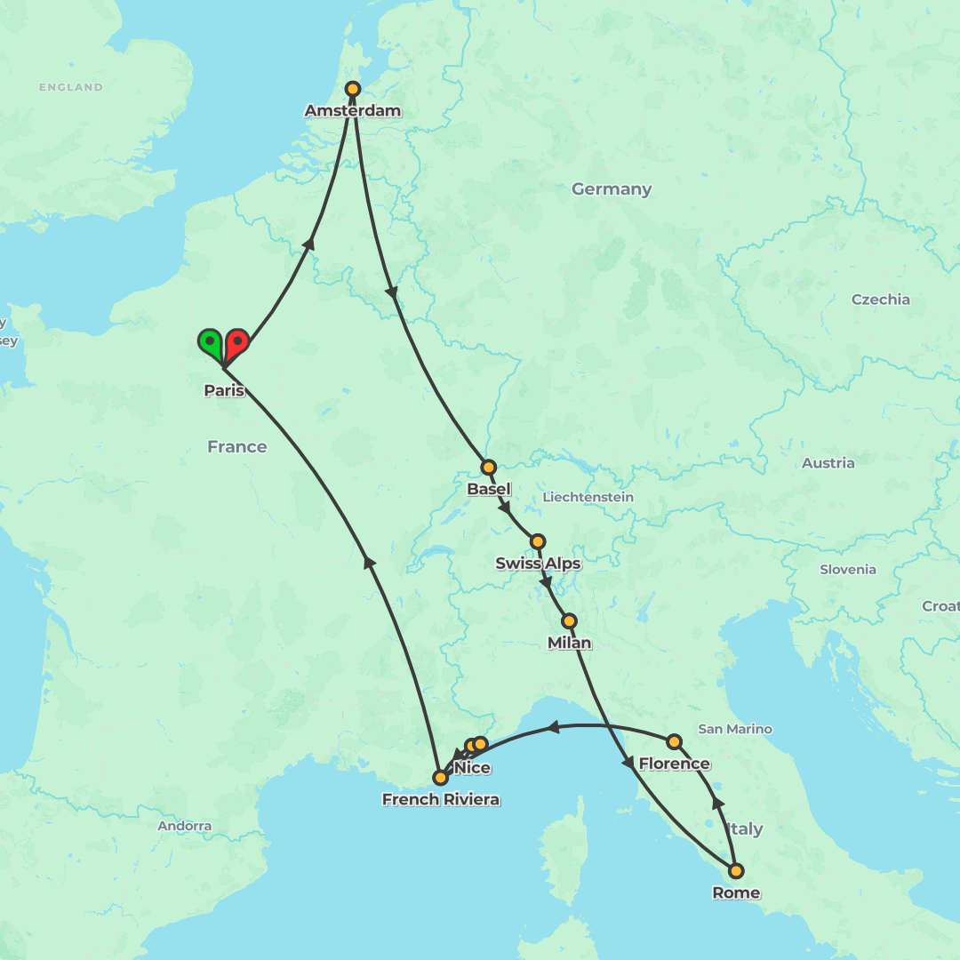 A 16-day youth-focused rail-and-coach adventure through Paris, Amsterdam, the Swiss Alps and Italy to the French Riviera, blending iconic moments, free time and a dedicated Trip Leader.