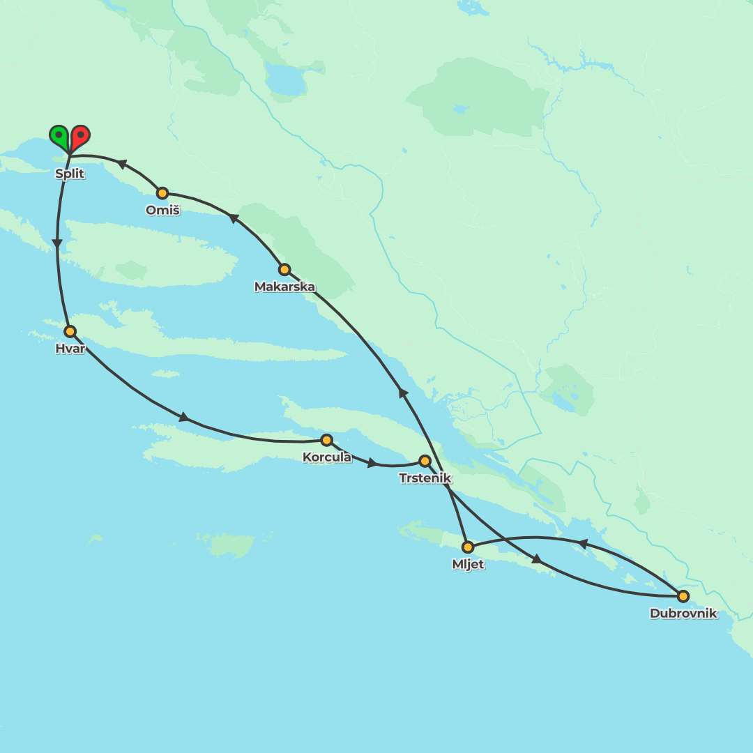 Sail from Split to Dubrovnik over 8 days on Croatia’s Dalmatian coast with island orientation walks, swim breaks, and a guided Dubrovnik city tour.