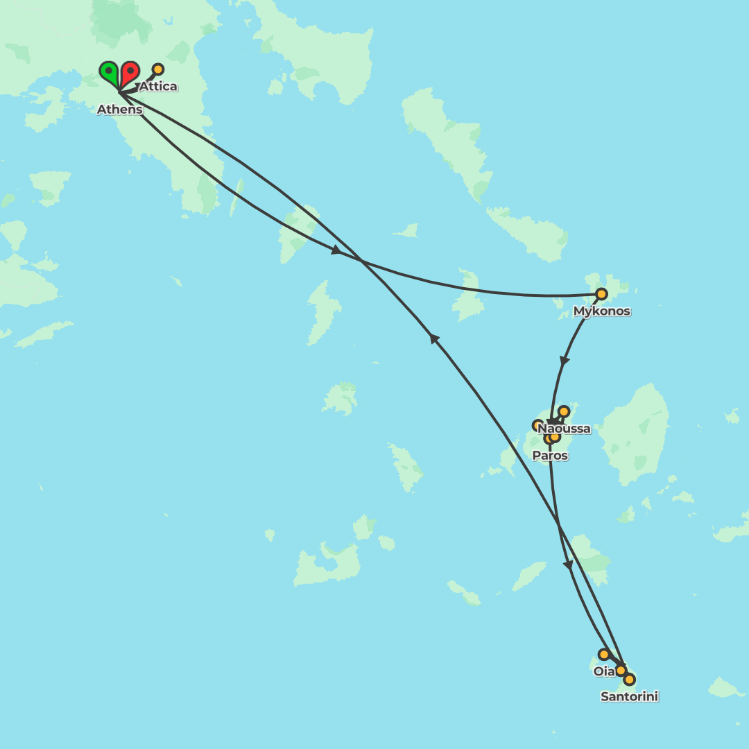 Island-hop from Athens to Mykonos and Santorini with guided tours, scenic ferries, unforgettable dinners and sunsets, plus convenient transfers throughout.
