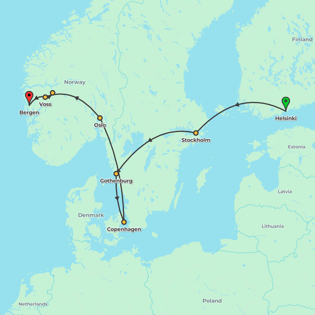 Explore Finland, Sweden, Denmark and Norway from Helsinki to Bergen on a 14-day Trip Leader–hosted journey with overnight ferries, city walking tours and free time to chase Nordic culture and scenery.