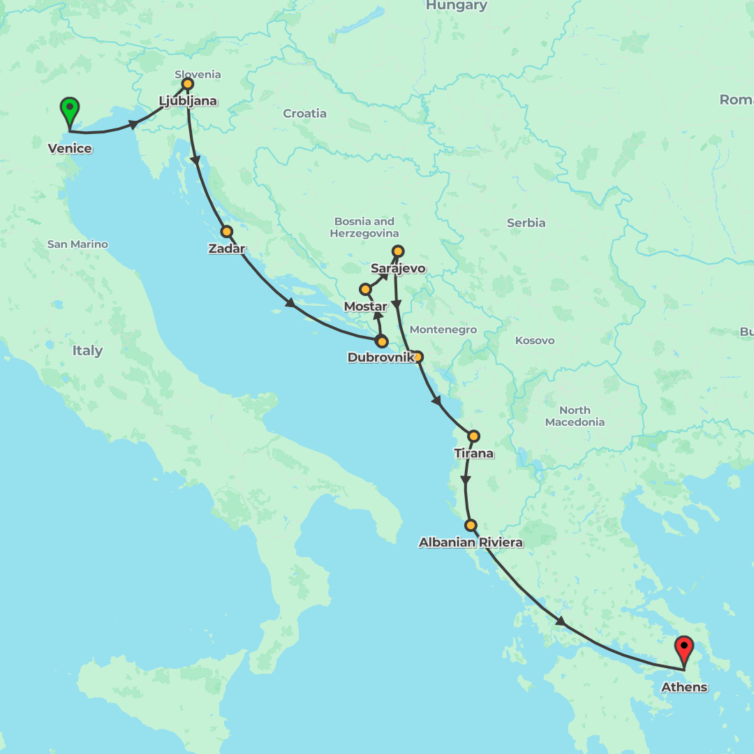 Journey from Venice to Athens through Italy, Slovenia, Croatia, Bosnia & Herzegovina, Montenegro, Albania and Greece, traveling by trains and coaches with a Trip Leader.