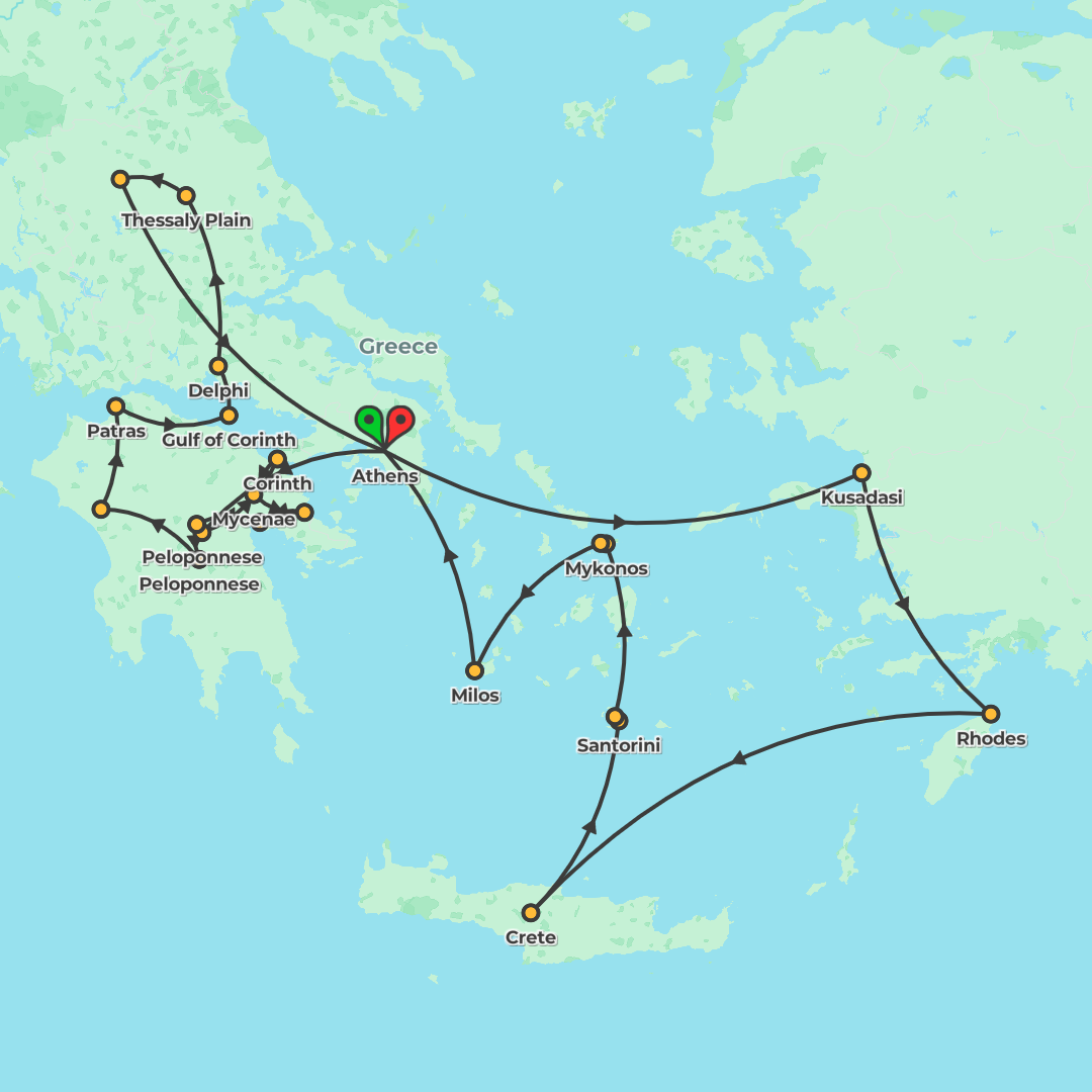 Discover ancient wonders and sun-soaked islands on a 15-day guided journey through Greece and Turkey, combining Athens, Delphi, Meteora and Olympia with an Aegean cruise to Crete, Santorini, Mykonos,