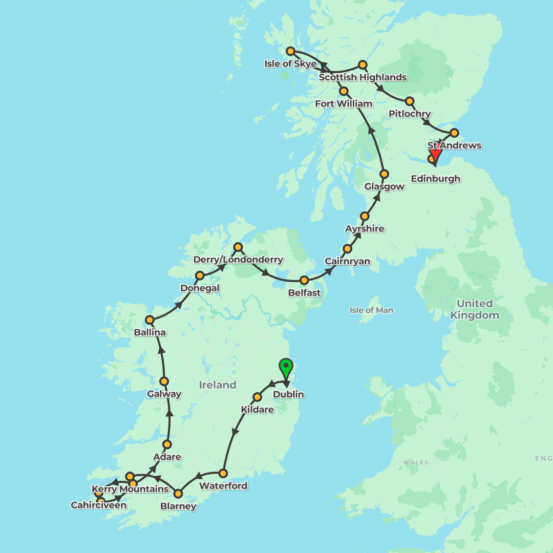 Discover Ireland, Northern Ireland and Scotland from Dublin to Edinburgh, featuring Belfast’s Titanic history, scenic highland drives, castles, a distillery visit and a ferry crossing.