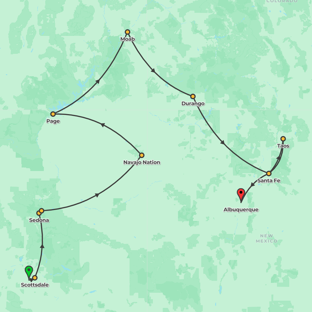 Journey from Phoenix and Scottsdale to Albuquerque, staying inside Grand Canyon National Park and at Durango’s historic Strater, with Navajo-hosted Monument Valley experiences and visits to Horseshoe