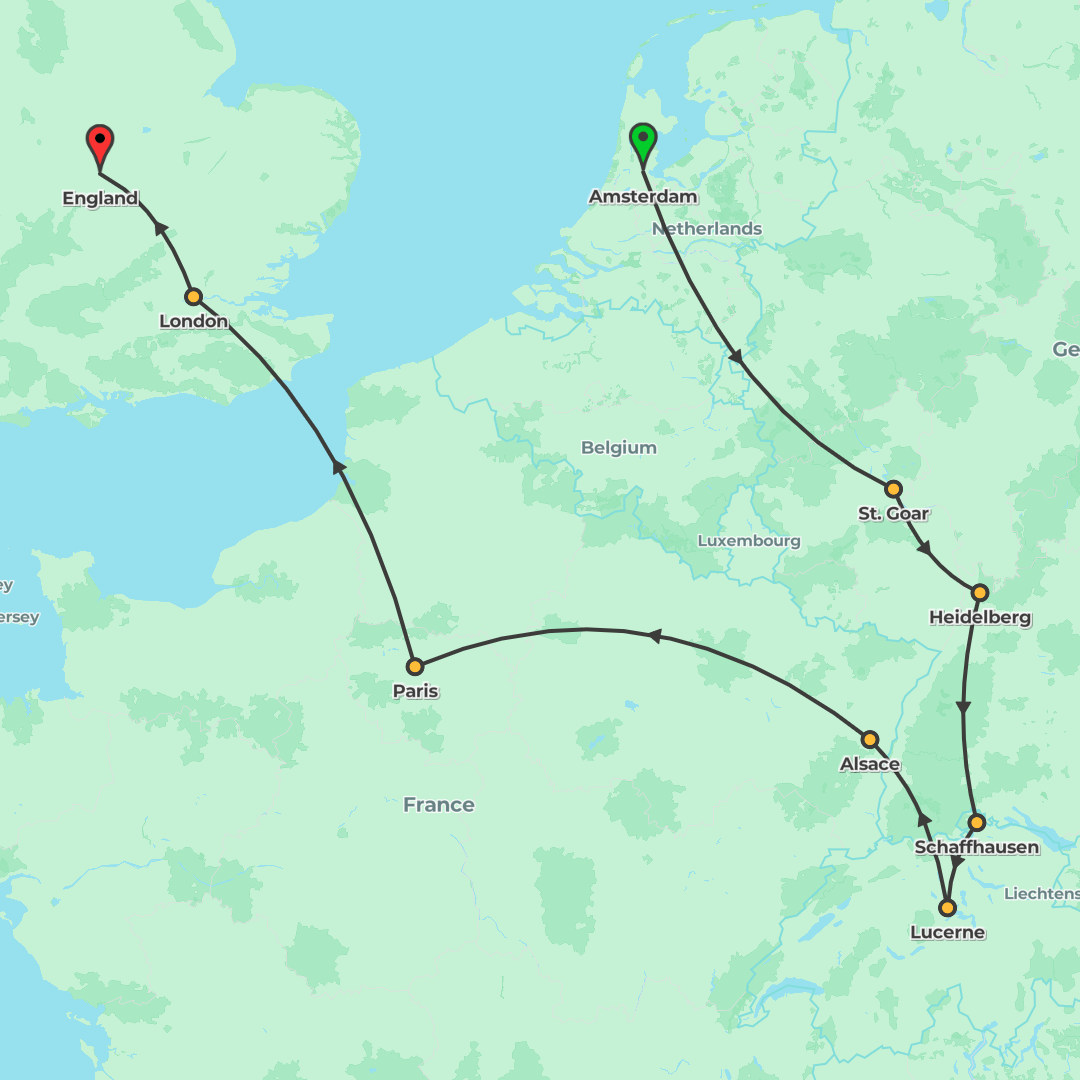 A sweeping 29‑day journey from London to Amsterdam across Europe’s icons, combining guided sightseeing, special local experiences, and memorable moments by rail, coach and water.