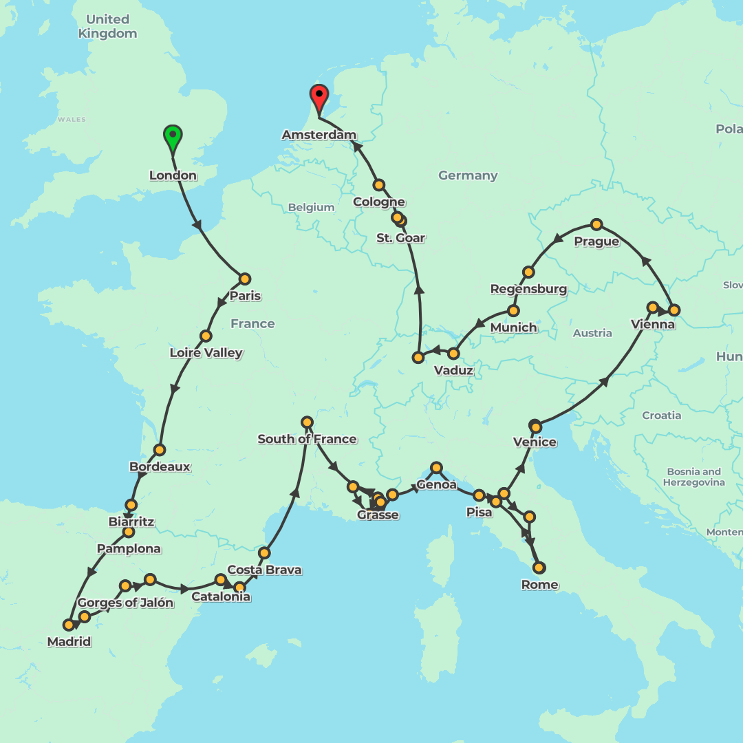 A classic group journey from London to Amsterdam that explores Paris, San Sebastián, Madrid and Barcelona, the French Riviera and Monaco, Italy’s icons from Florence to Venice, Slovenia and Austria to