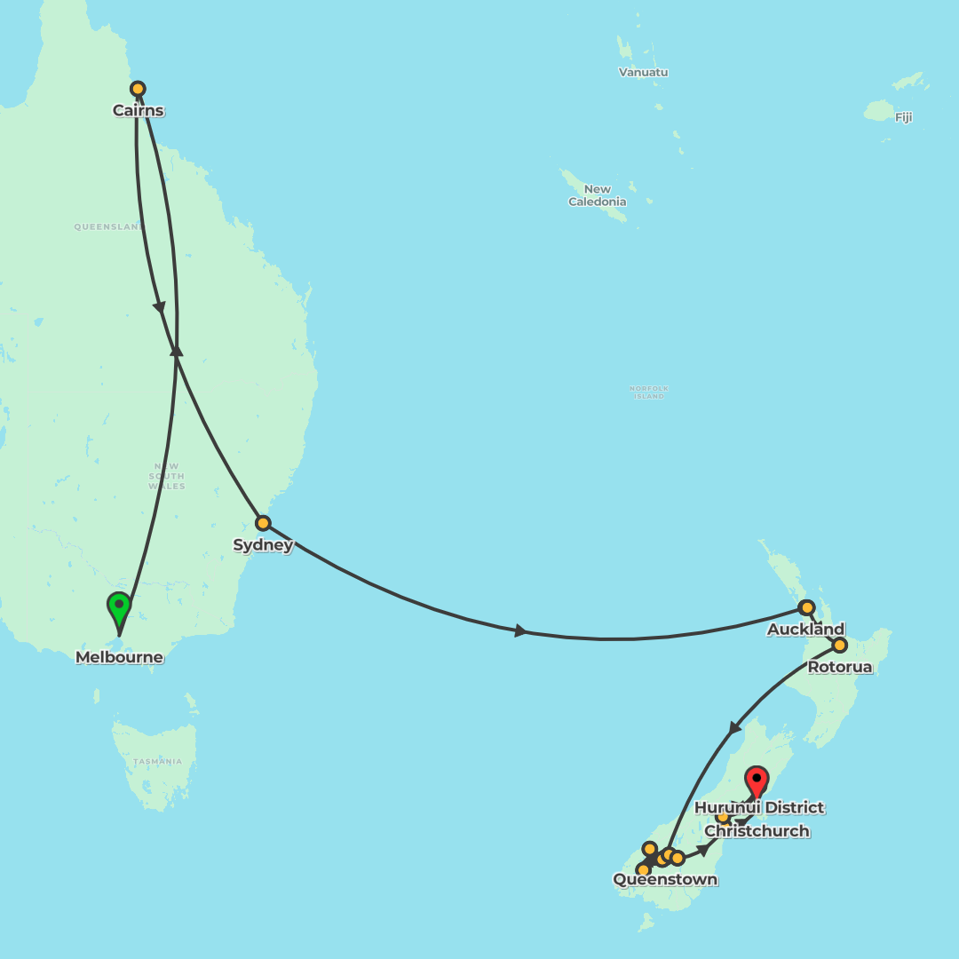 A 22-day guided journey from Melbourne to Christchurch, discovering Uluru, the Great Barrier Reef, Sydney, Auckland, Rotorua, Queenstown and Lake Tekapo with cultural experiences and memorable cruises