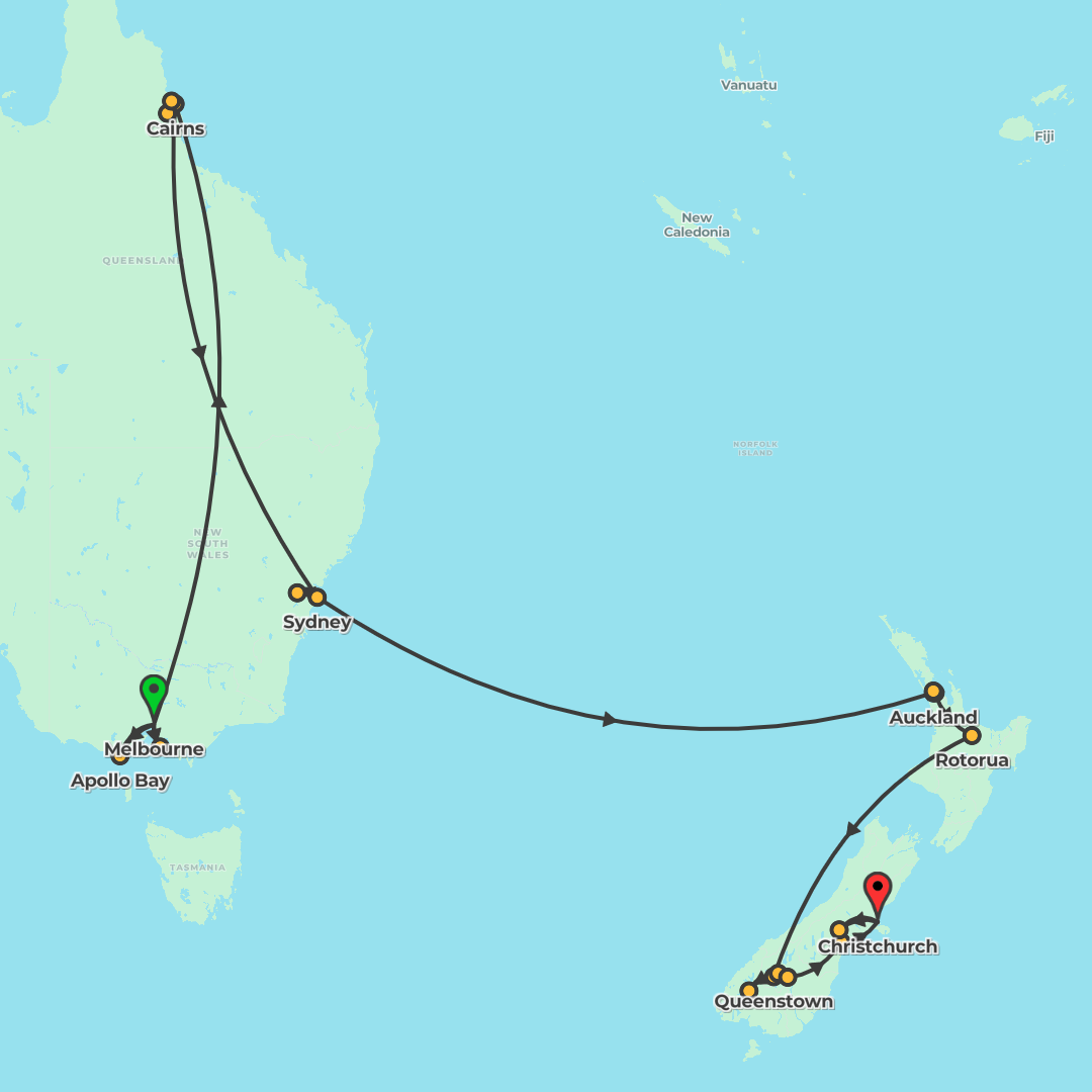 A 22-day guided journey from Melbourne to Christchurch, discovering Uluru, the Great Barrier Reef, Sydney, Auckland, Rotorua, Queenstown and Lake Tekapo with cultural experiences and memorable cruises