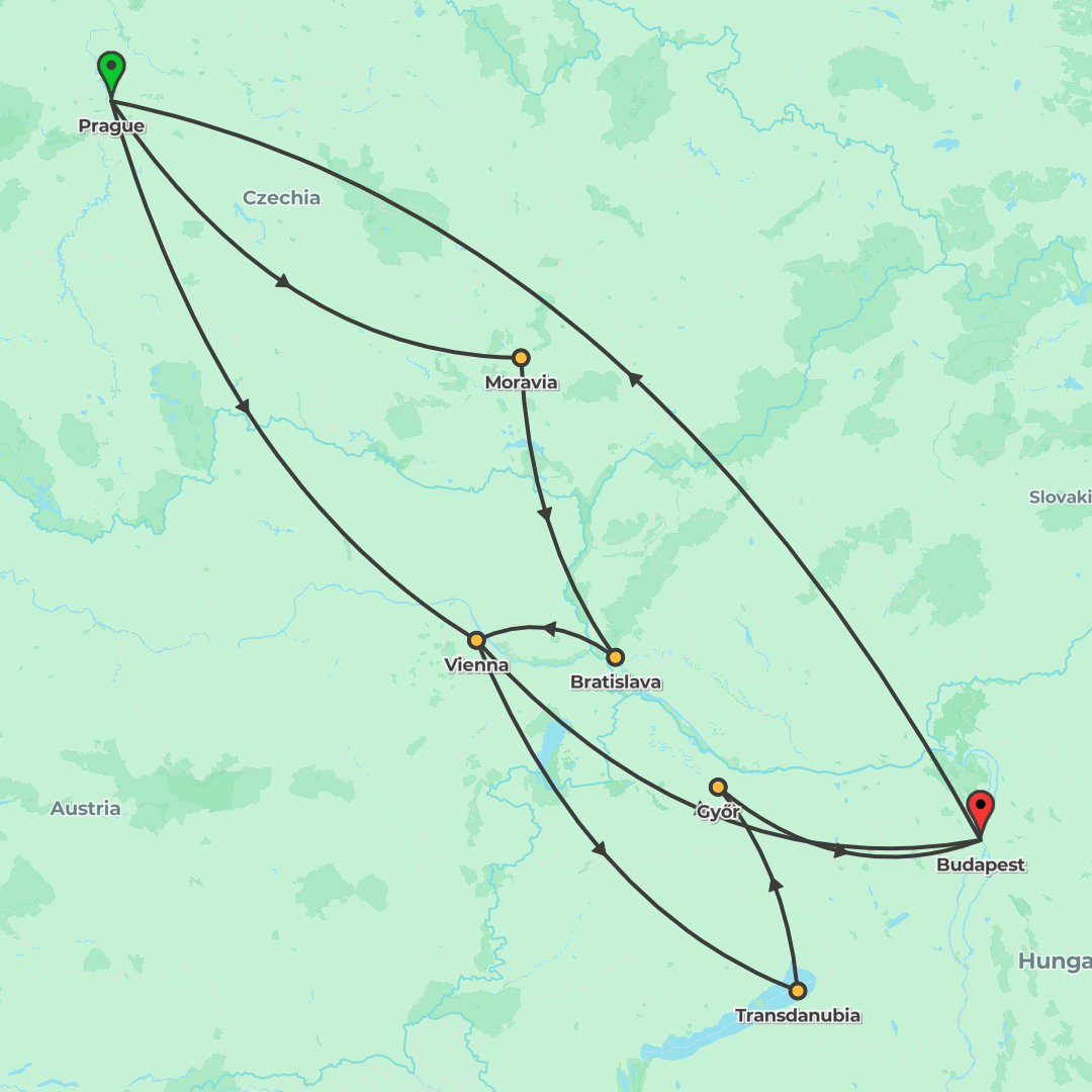 Discover Eastern Europe’s capitals and wine country in one week, traveling from Budapest to Prague via Bratislava, Vienna and Mikulov with guided walks, Chateau Lednice’s park and a wine tasting.