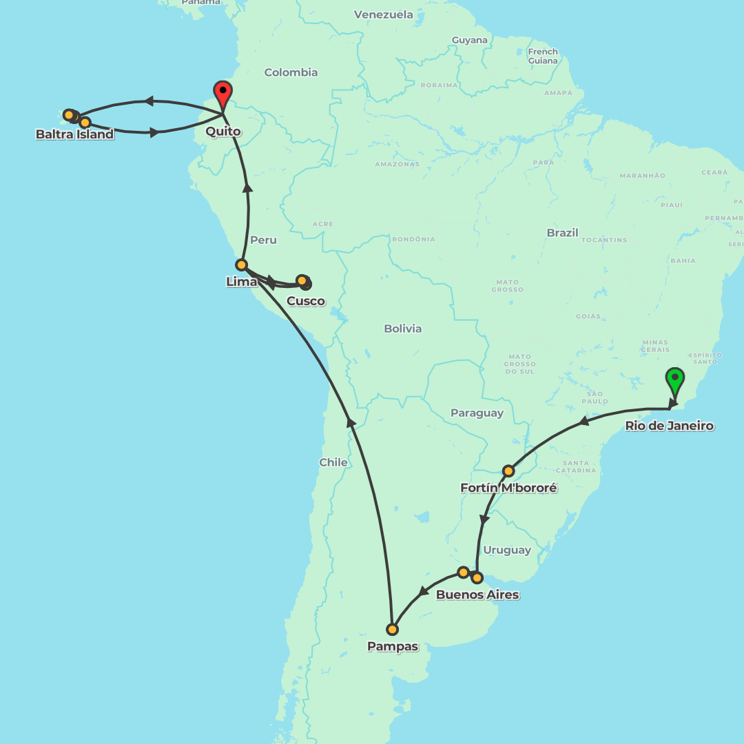 An 18-day journey from Cusco to Rio de Janeiro linking Machu Picchu by train, Amazon rainforest stays, vibrant Buenos Aires and Iguassu Falls, connected by internal flights and led throughout by a ded