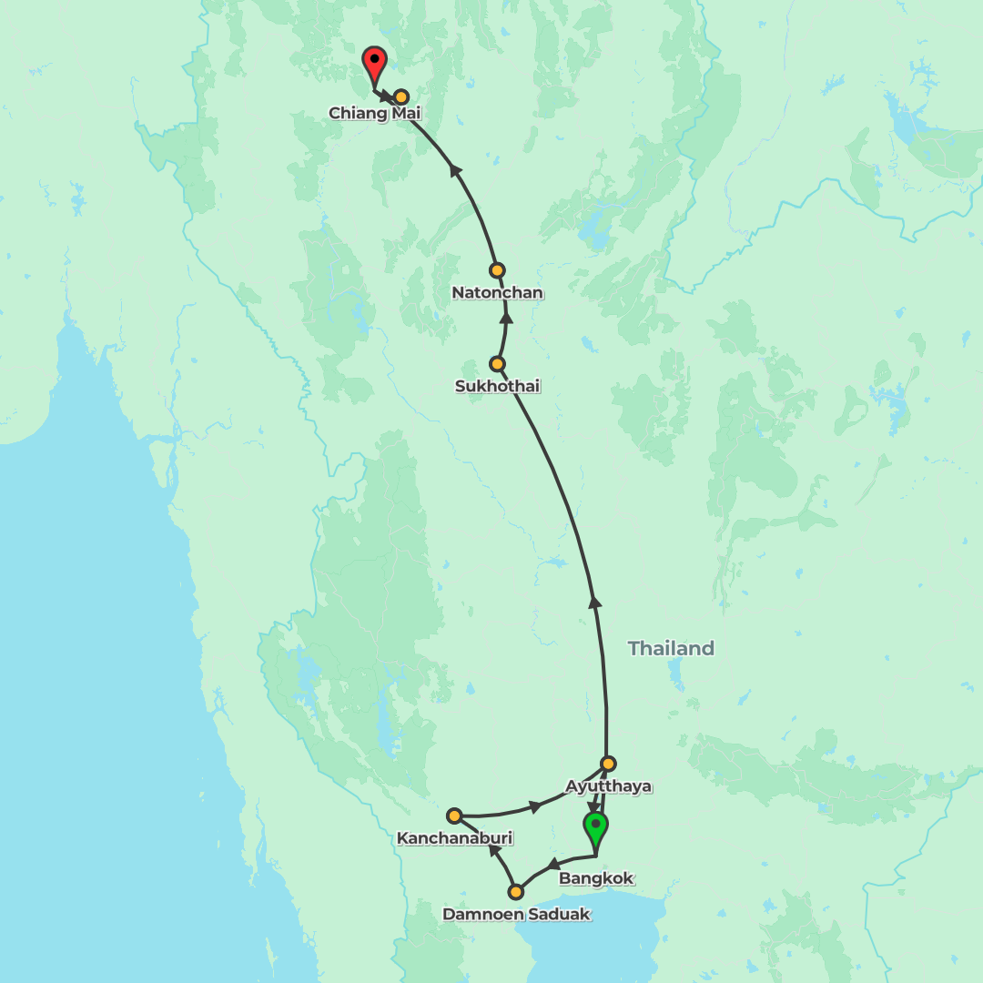 Journey from Bangkok to Chiang Mai through Ayutthaya, Kanchanaburi and Sukhothai on a guided Thailand adventure filled with landmark temples, moving WWII history and authentic local experiences.