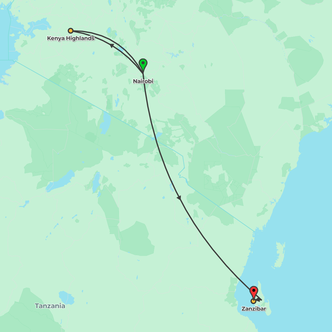 Journey from Nairobi through Maasai Mara, Amboseli, Lake Manyara, Ngorongoro and the Serengeti, concluding in Stone Town before flying out of Dar es Salaam.