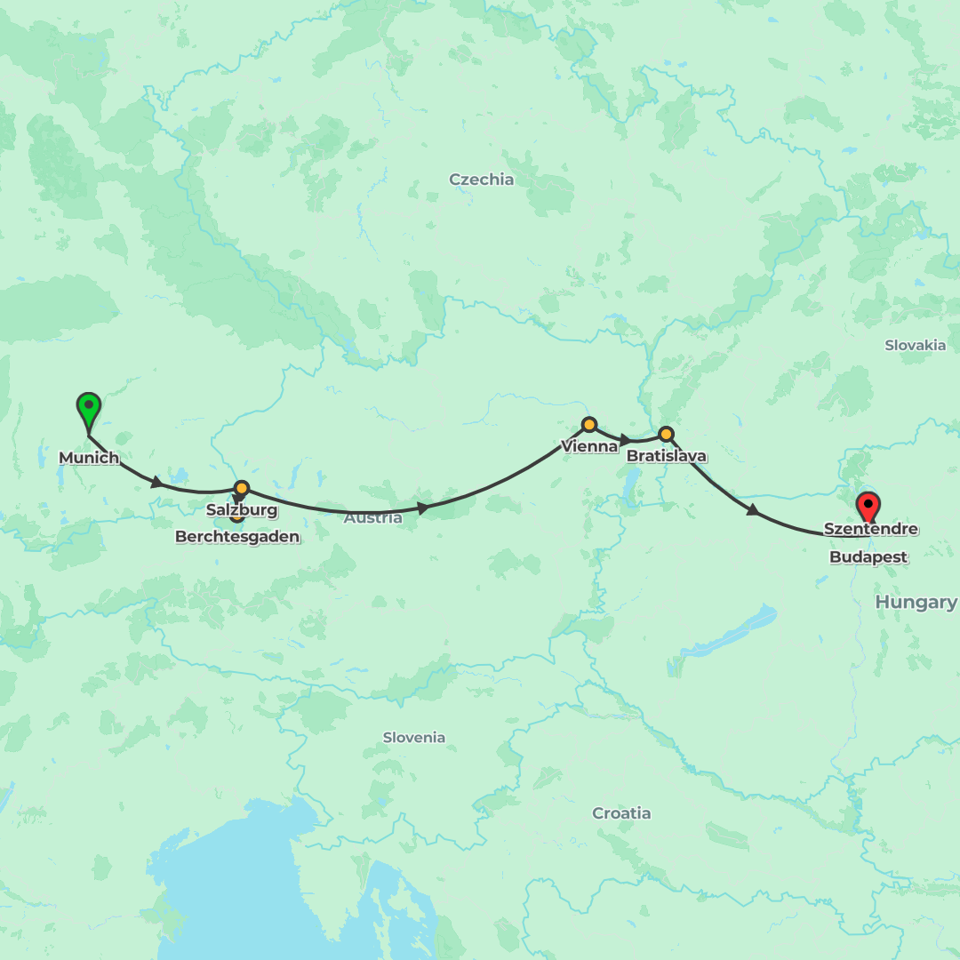 Experience Christmas markets on a journey from Munich to Budapest with 4-star hotels, breakfasts and air‑conditioned coach or mini‑bus travel.