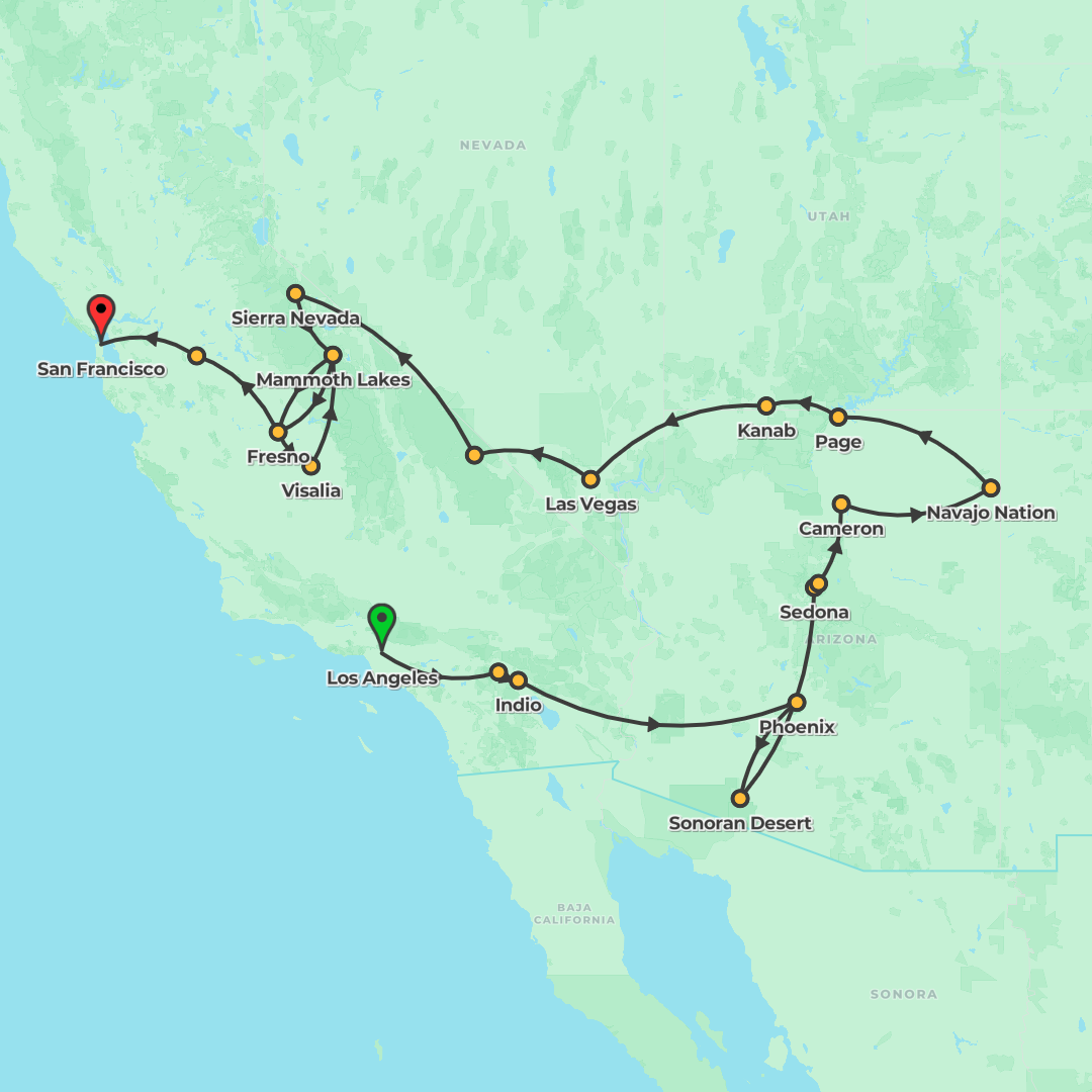 Experience an 11‑day guided journey from Los Angeles to San Francisco through the Southwest’s iconic cities, deserts, and national parks.