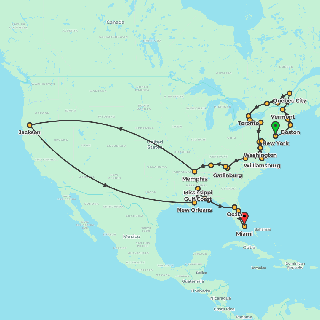 Journey from New York to Miami by A/C coach with 3–4 star stays, guided orientation walks, and experienced tour leaders, uncovering cultural highlights across the U.S. and Canada.