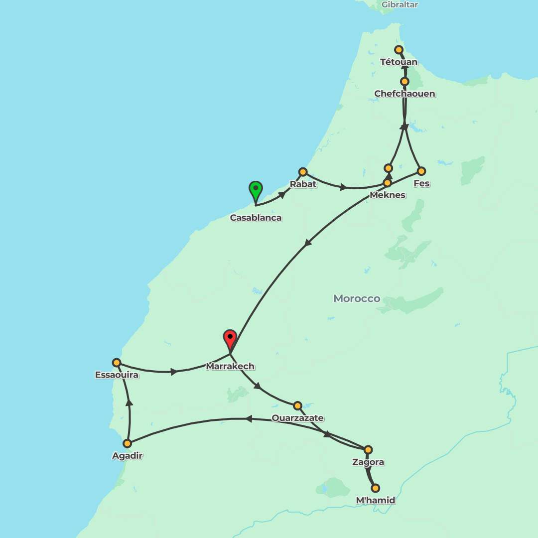 A 14-day Morocco journey from Casablanca to Marrakech with 4-star stays, guided highlights, a Sahara desert camp, and scenic coach travel along cities, mountains, and coast.