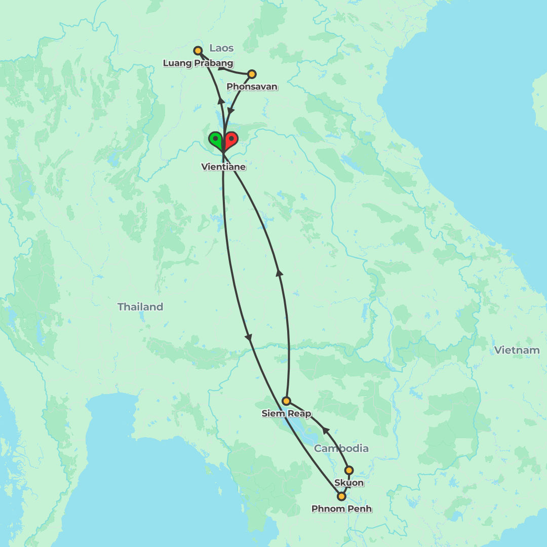 A two-week escorted small group journey through Laos and Cambodia, from Vientiane and Luang Prabang to Phnom Penh and Angkor, combining scenic rail, boat and overland travel with boutique accommodation and immersive temple visits.