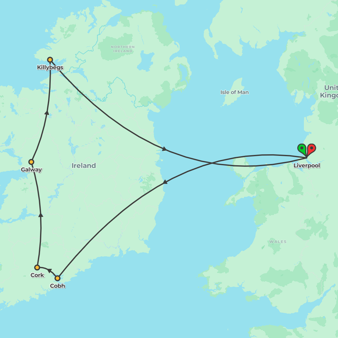 Sail round-trip from Liverpool to Ireland’s Cobh, Galway and Killybegs, with relaxing days at sea along the way.
