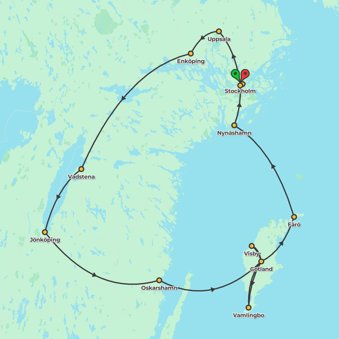 Stay in central Uppsala at Clarion Hotel Gillet, then move to a stylish hotel in Vadstena comprising old monastic buildings with guest rooms separate from the main building. Overnight in Oskarshamn, continue to accommodation in Visby, and finish in a quietly situated Sodermalm hotel convenient for the metro.