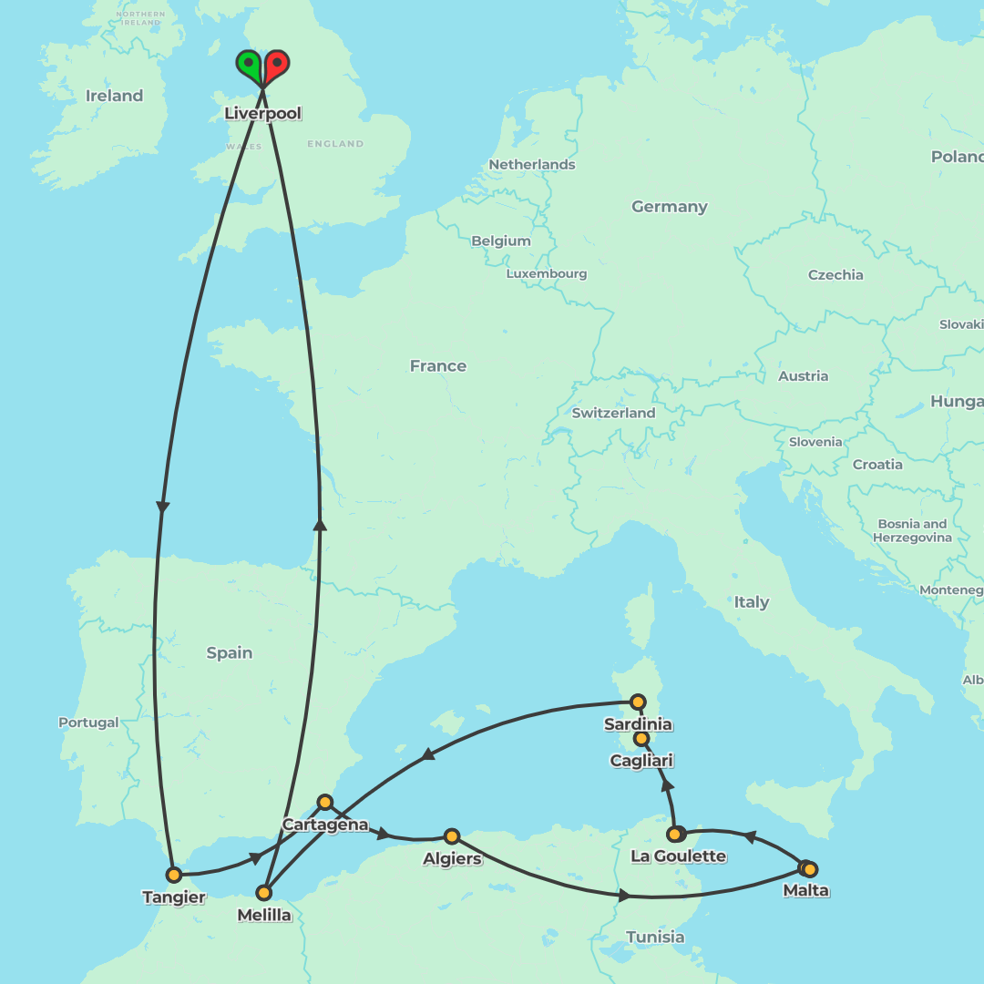 Sail roundtrip from Liverpool to explore North Africa and the Mediterranean with sea days and port calls including Tangier, Cartagena, Algiers, Valletta, Tunis, Cagliari and Melilla.