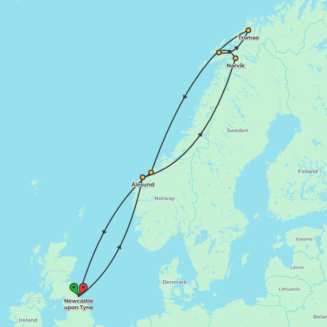 Sail from Newcastle across the Arctic Circle to evocative Norwegian ports in search of the Northern Lights on a scenic ocean cruise.