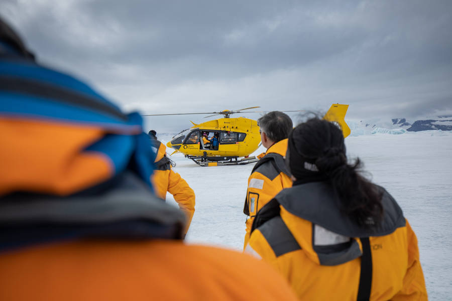 Soar by helicopter above the Antarctic Peninsula’s glaciers and peaks.