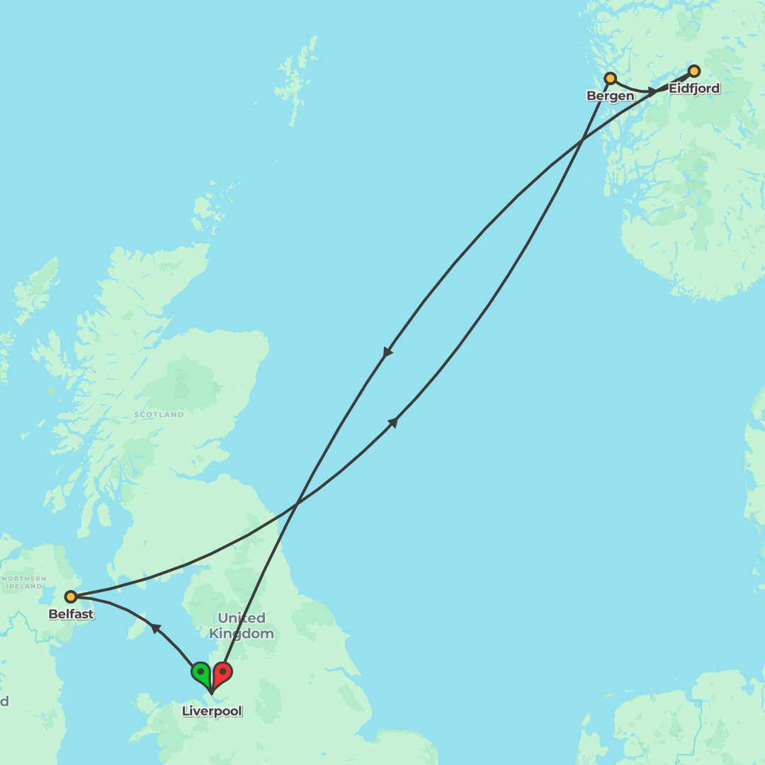 Cruise round-trip from Liverpool to Belfast and Norway’s fjords, including Bergen and Eidfjord.