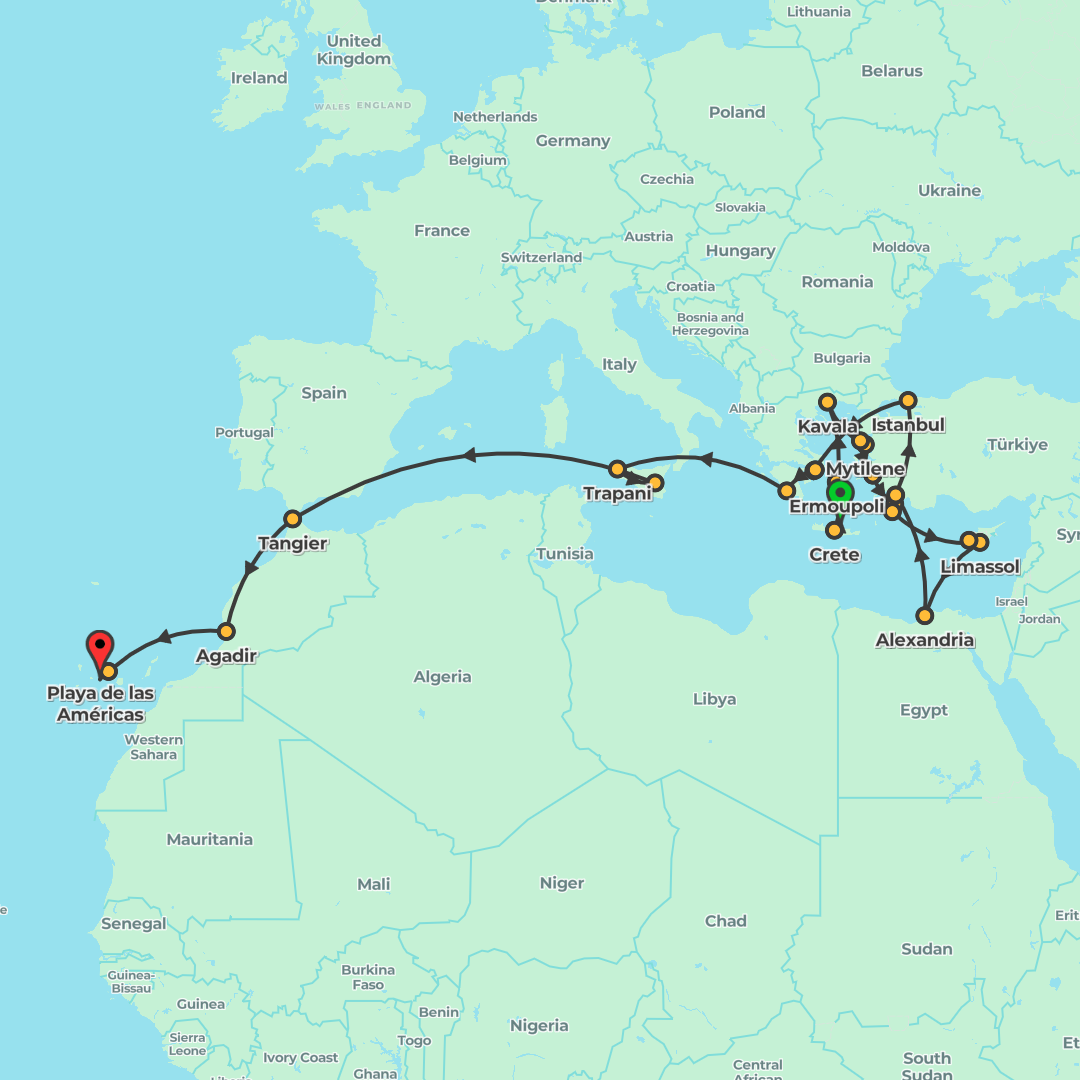 Sail from Crete to the Canary Islands on a far-reaching cruise calling at Greece, Cyprus, Egypt, Turkey and Morocco.