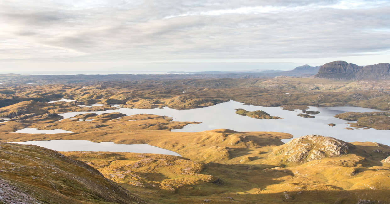 Climb Cul Mor in Assynt’s Torridonian sandstone landscape.