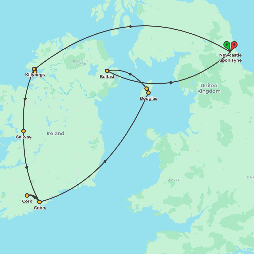 Sail round‑trip from Newcastle to explore Killybegs, Galway, Cobh, Douglas and Belfast, with relaxing days at sea along Ireland’s coast.
