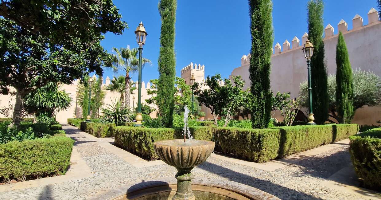 Wander Rabat’s Kasbah des Oudaias, Hassan Tower, and Mohammed V Mausoleum.