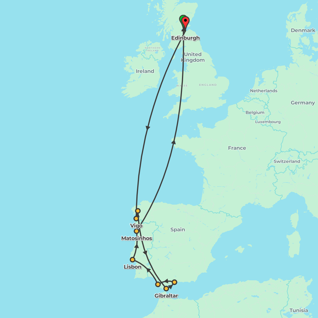 Sail round-trip from Rosyth to ports in Spain, Portugal and Gibraltar, with days at sea and a call at Lisbon via the mouth of the River Tagus.