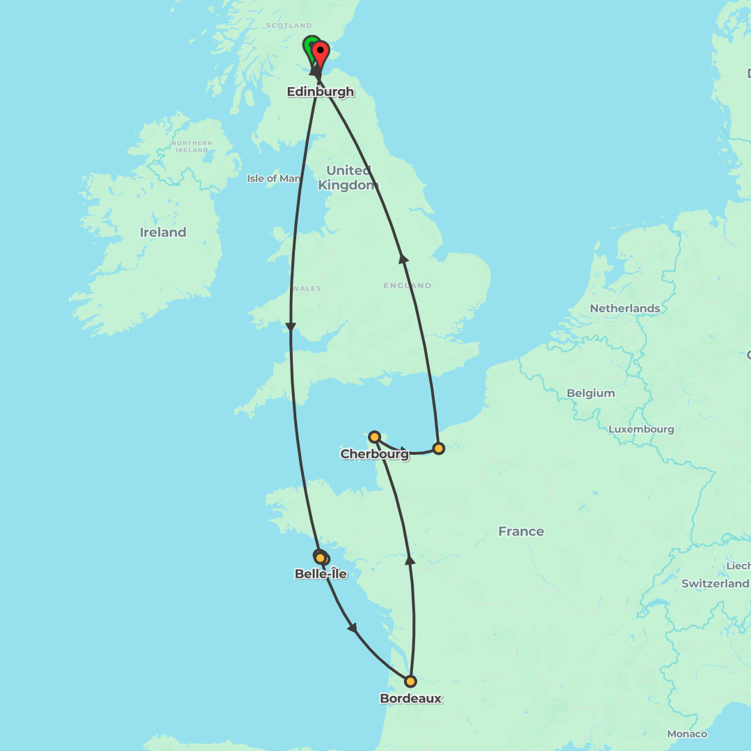 Sail round-trip from Rosyth to French ports including Belle-Île, Bordeaux, Cherbourg and Honfleur, with days at sea between calls.