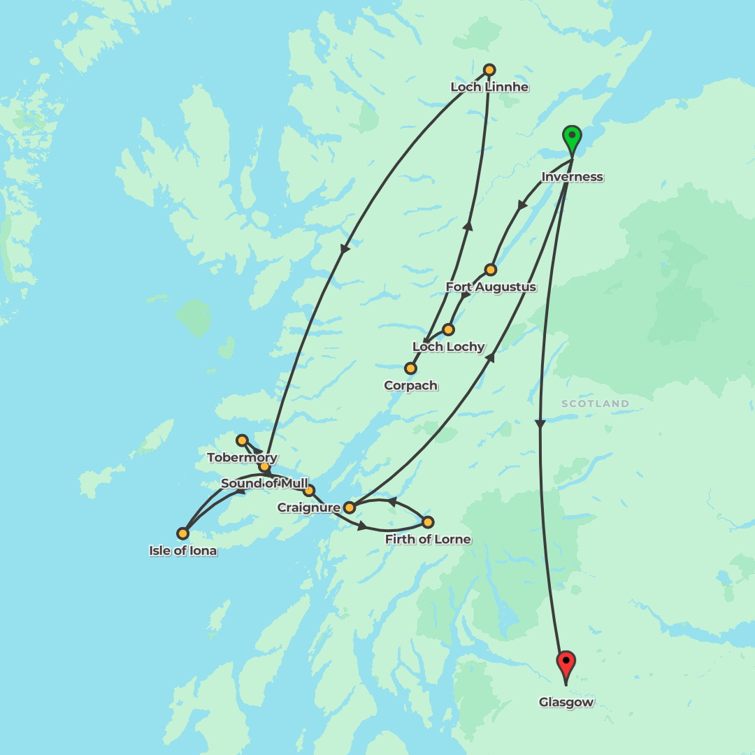 Sail Scotland’s Caledonian Canal and isles on a 7-day MV Lord of the Glens cruise, blending iconic scenery, rich history and welcoming onboard comforts.
