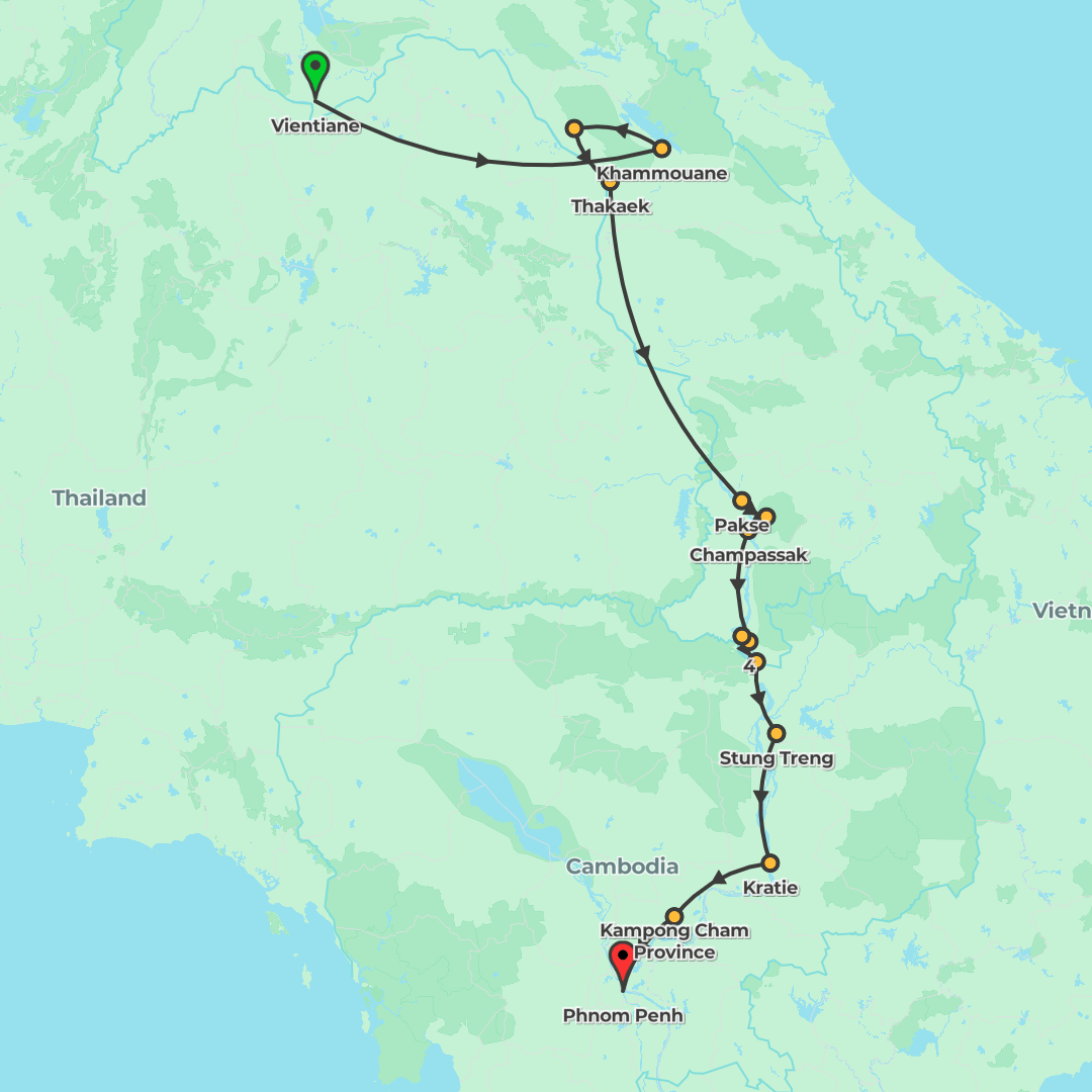 Explore the Mekong on a 2-week small group journey from Vientiane to Phnom Penh, weaving through southern Laos and northern Cambodia by road and river with standout scenery and cultural highlights.