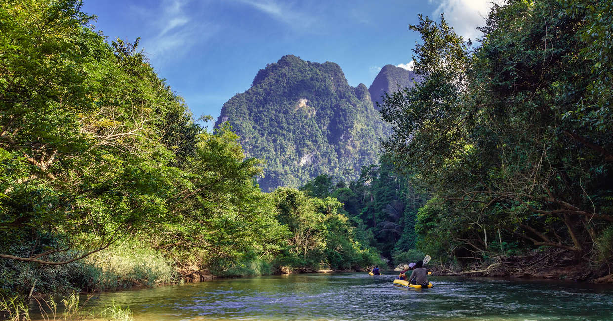 Kayak past towering cliffs on the Khao Sok River, with swimming stops.