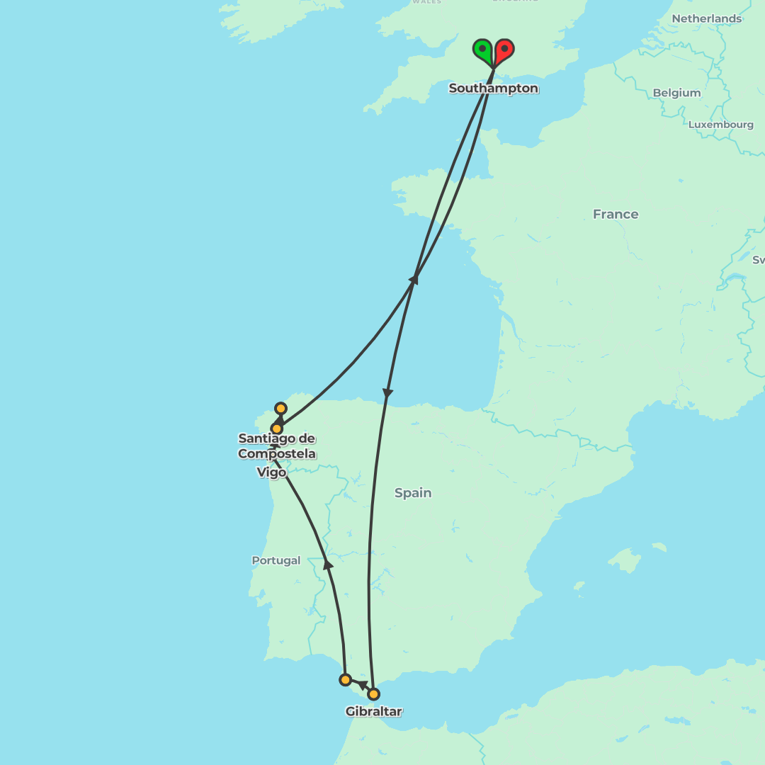 Round-trip cruise from Southampton to Spain and Gibraltar, blending relaxing sea days with characterful Atlantic ports.